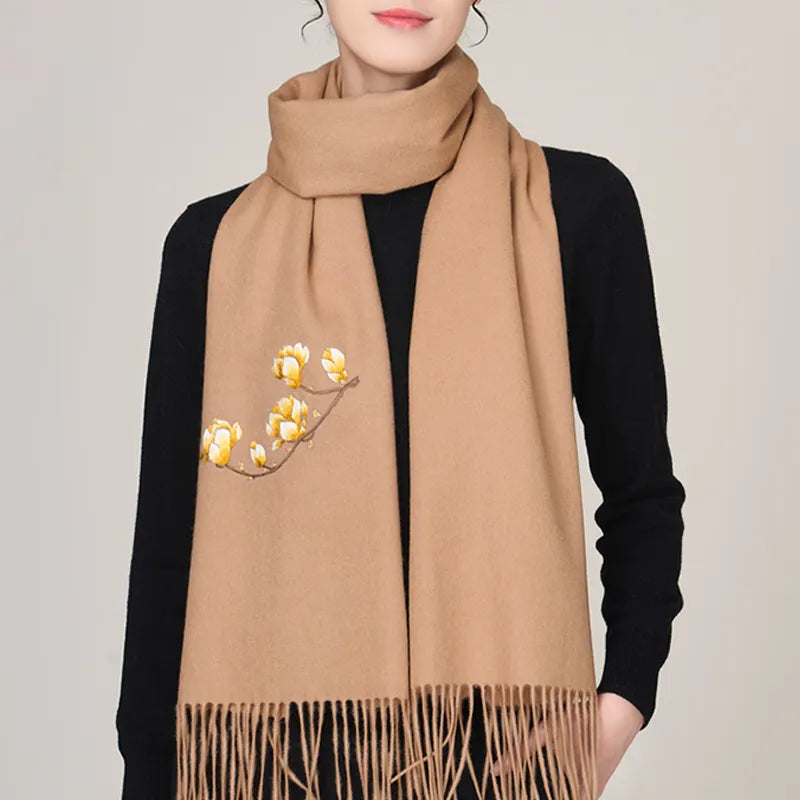 Handmade Suzhou Embroidery Wool Cashmere Scarf With Magnolia Flower 200 x 38 cm