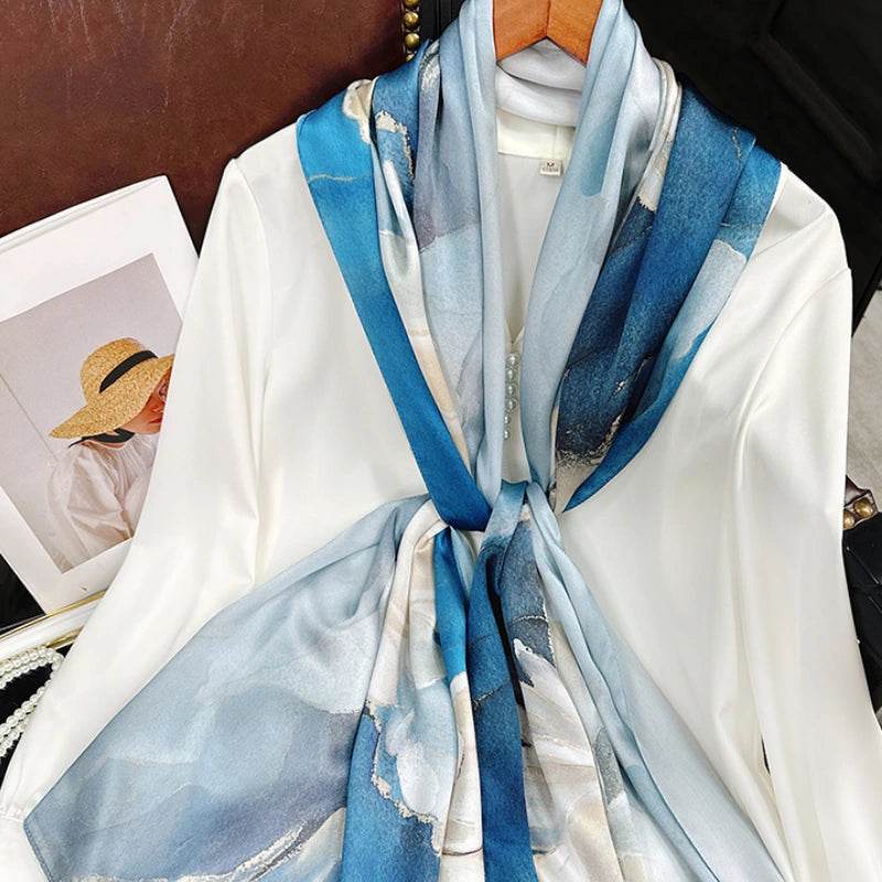 - When using or storing the scarf, avoid direct contact with desiccants, cosmetics, perfumes, etc. If the scarf accidentally gets stained, handle it promptly: place a tissue on the stained surface and use the back of a dry towel to pat the stain, allowing it to absorb into the tissue. PS: Silk scarves should avoid exposure to rain; if accidentally wet, flatten and air dry immediately.