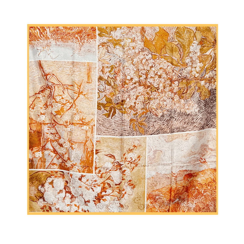 A vibrant canvas of spring, brimming with life. Each scarf is a living masterpiece, vividly portraying the beauty of spring. Elegant and refined, exquisitely beautiful. Showcasing unique artistic charm, allowing you to immerse in the warmth of spring.
