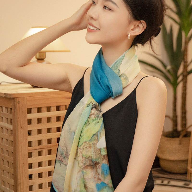 Experience the timeless beauty of Wang Ximeng’s masterpiece, the ‘Thousand Miles of Rivers and Mountains‘千里江山图 now captured in exquisite detail on our Chinese Painting Silk Scarf from the Chinese Art Series.