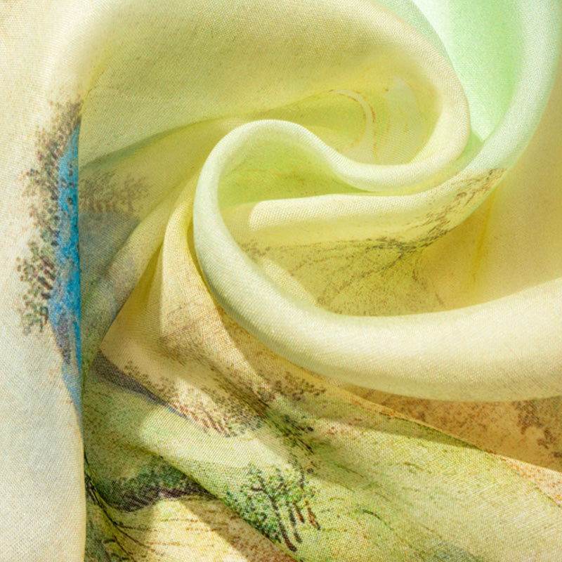 Our silk scarf draws inspiration from the serene landscapes depicted in the painting, featuring mountains adorned in shades of indigo, with misty waters meandering gently beneath. Transport yourself to a realm of boundless beauty and tranquility as you adorn yourself with this exquisite piece of artistry.